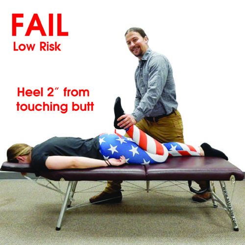 This test should not be done unless the Face-Up Heel to Butt Test is a pass. If the Face-Up Heel to Butt Test is a fail, this test will show up as a false positive and you might think you can safely stretch the quad. You can’t safely stretch the quad unless the Face-Up version is a pass.